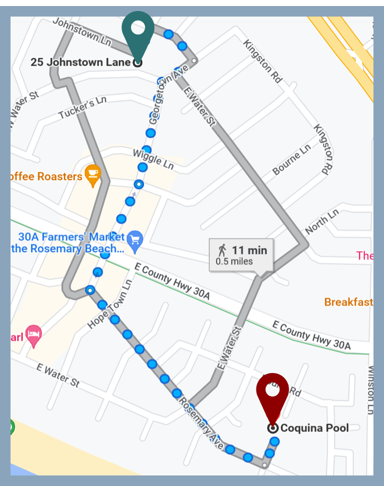 Our favorite little route is 2.46 miles. Head out the front door down Georgetown Avenue through town. Make a right and go up 30A to the second Alys Beach tower and head on back.